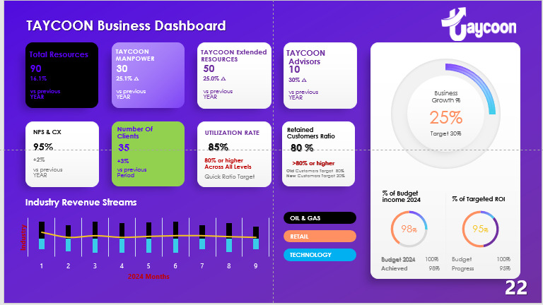 1. KPIs: Key performance indicators that measure the success of the business, such as revenue, profit, customer satisfaction, and employee productivity.